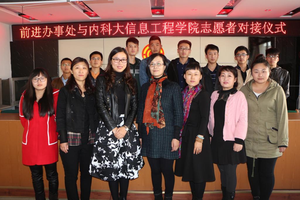 10月14日下午,永利集团3044官网欢迎您青马班志愿者与包头市昆区前进街道办事处对接仪式在昆区前进街道办事处举行。前进办事处主任纪杰,办公室主任姚建锋,社会服务科科长刘霞以及内科大信息学院学工办龙鹤老师出席了此次对接仪式。