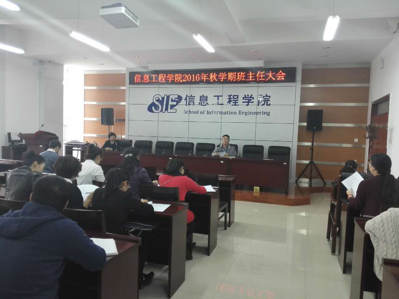 10月20日下午,我院2016年秋学期班主任大会在逸夫楼F302会议室召开。学院党总支书记崔桂梅教授出席会议,副书记、副院长段志峰老师主持会议,全院各年级班主任、学团办老师参加会议。