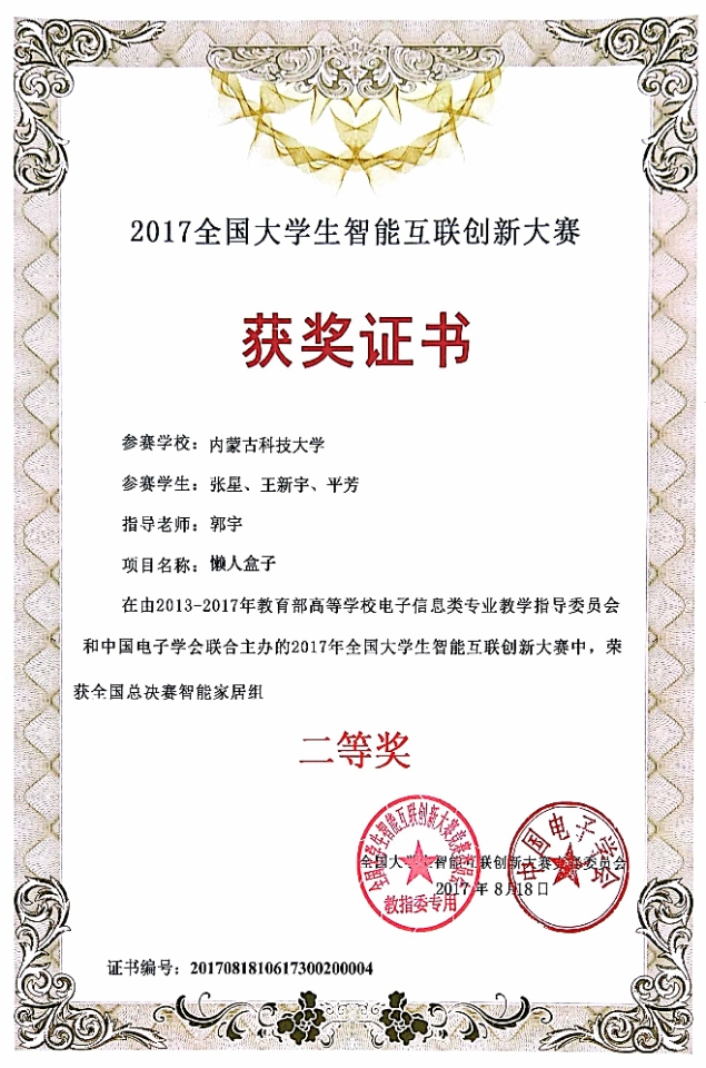 2017年8月17日至19日,由教育部高等学校电子信息类专业教学指导委员会和中国电子学会联合主办第二届“全国大学生智能互联创新大赛”全国总决赛在重庆邮电大学举行。来自包括我校、哈尔滨工业大学、电子科技大学、北京邮电大学等近200所高校的967支队伍参加比赛。我院学生张星、平芳与机械工程学院学生王新宇共同完成的项目“懒人盒子”在本次大赛中获全国二等奖。同时,我院臧琛瀚、刘存凯、翟天坤等同学分别完成的三个项目获得华北赛区二等奖,颜蒙蒙等同学完成的两个项目获得华北赛区三等奖。
