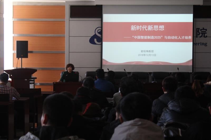 习近平总书记在党的十九大报告中号召“加快建设制造业强国,加快发展先进制造业”。为响应党和国家的号召,增强师生的理想信念教育,培养师生的使命担当意识,2018年12月27号下午2:30,我院党总支书记崔桂梅教授在逸夫楼F302讲授了主题为“新时代新思想--中国智能制造2025与自动化人才培养”的思政理论课。自动化专业教师及学生,学团办所有老师聆听了课程。