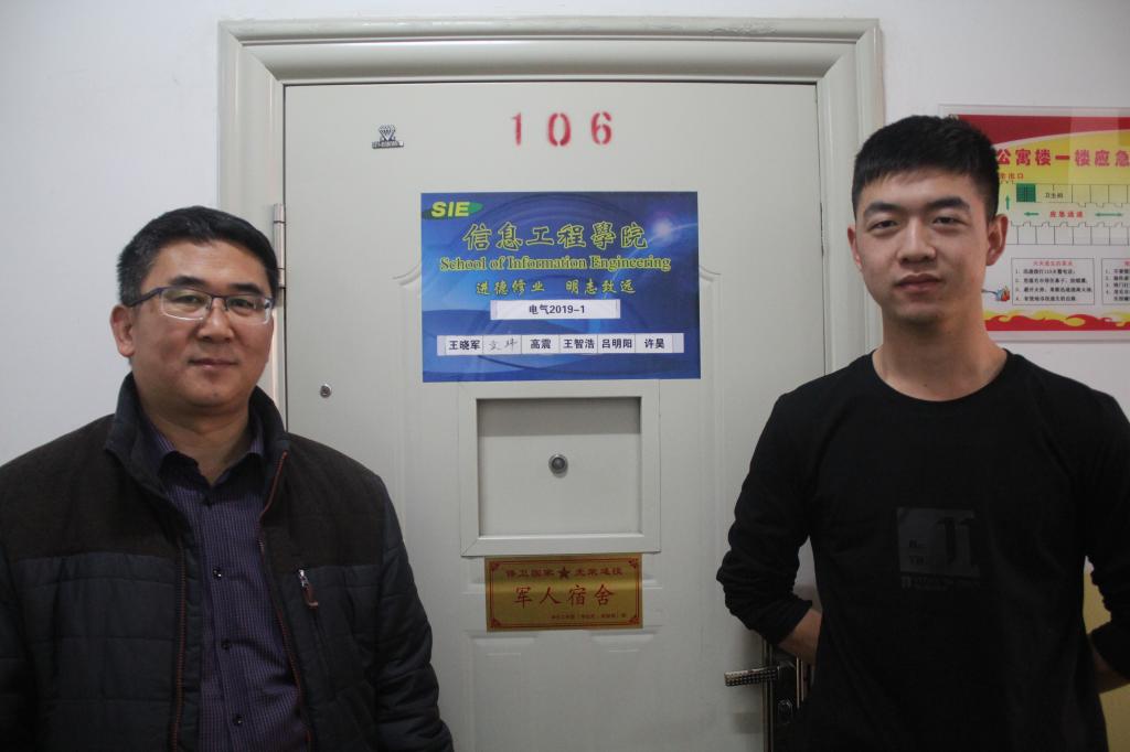 活动中,段志峰老师一行走访了退伍学生宿舍,对学生们退伍复学后遇到的问题进行了详细的询问和解答,他表示,创建退伍学生示范宿舍是信息工程学院推动学生公寓文明建设、增强学生责任意识的重要举措,具有十分重要的意义,要做到:第一,亮军人身份,树军人榜样。“军人宿舍”意味着军人身份在全体学生面前再一次亮明。他倡导退伍学生要时刻按照军人的标准严格要求自己,积极发挥军人榜样作用,以自身带动全寝室,从而以退伍军人示范宿舍为依托,带动全院学生努力营造温馨整洁的公寓氛围,形成良好的学习风气。第二,明责任意识,抓公寓建设。退伍军人示范宿舍意味着学生公寓建设与管理以军人宿舍为范本,全体退伍学生要以此为荣,更要以身作则。