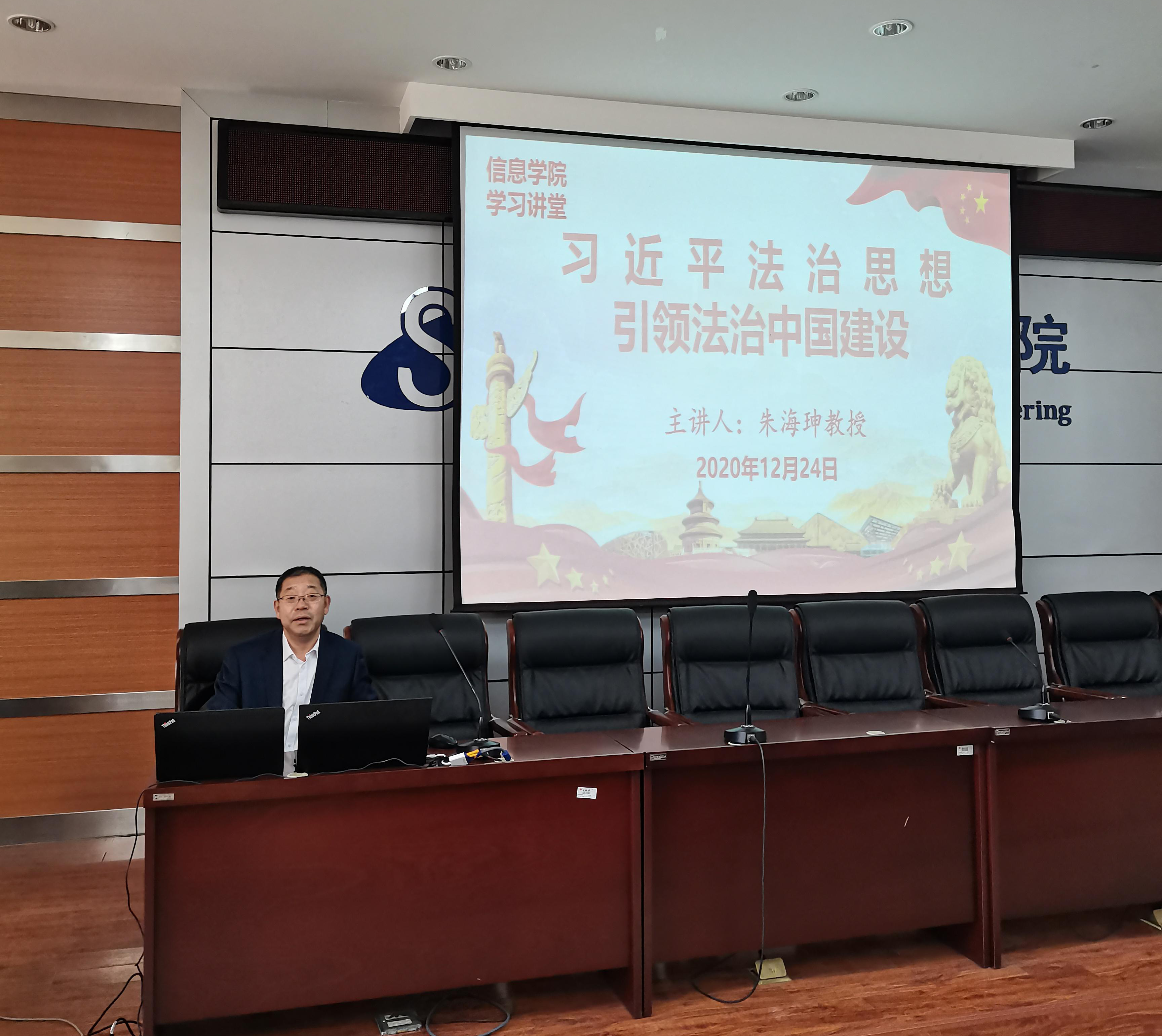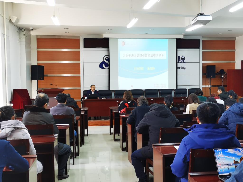 为深入学习贯彻习近平新时代中国特色社会主义思想,2020年12月24日下午,我院邀请文法学院朱海珅教授做题为《习近平法治思想引领法治中国建设》的专题讲座。我院党总支书记崔桂梅、院长李宝山和全体教职工参加了讲座。