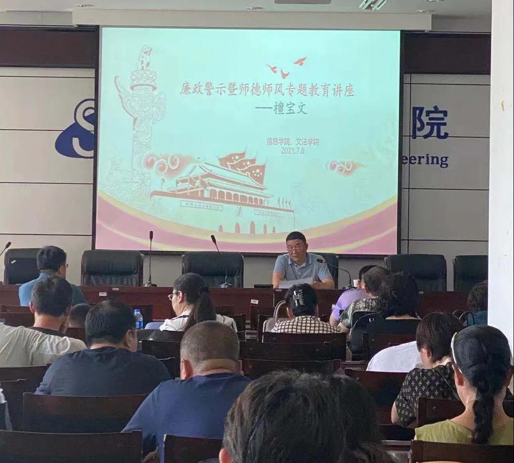 2021年7月8号,校纪委书记檀宝文在逸夫楼F302会议室为我院及文法学院全体教师做了廉政警示教育暨师德师风专题教育报告。