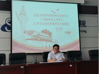 为全面推进师德师风建设工作,按照学校部署,8月19日,我院在逸夫楼F302进行师德师风教育专题党课。信息工程学院党委书记段志峰主持会议。