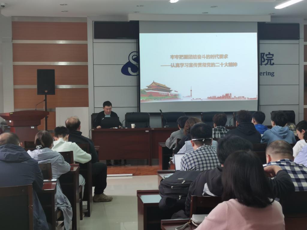 为进一步深入学习和宣传贯彻党的二十大精神,深刻领会、准确把握党的二十大重大意义、精神实质和丰富内涵,引领全院干部职工更加坚定地把思想和行动统一到党的二十大精神上来。2023年3月10日下午,我院特邀学校新时代讲习团杨哲副教授为师生党员开展题为《牢牢把握团结奋斗的时代要求——认真学习宣传贯彻党的二十大精神》,学院全体教职工、师生党员参加讲座。