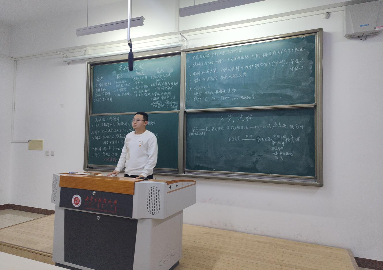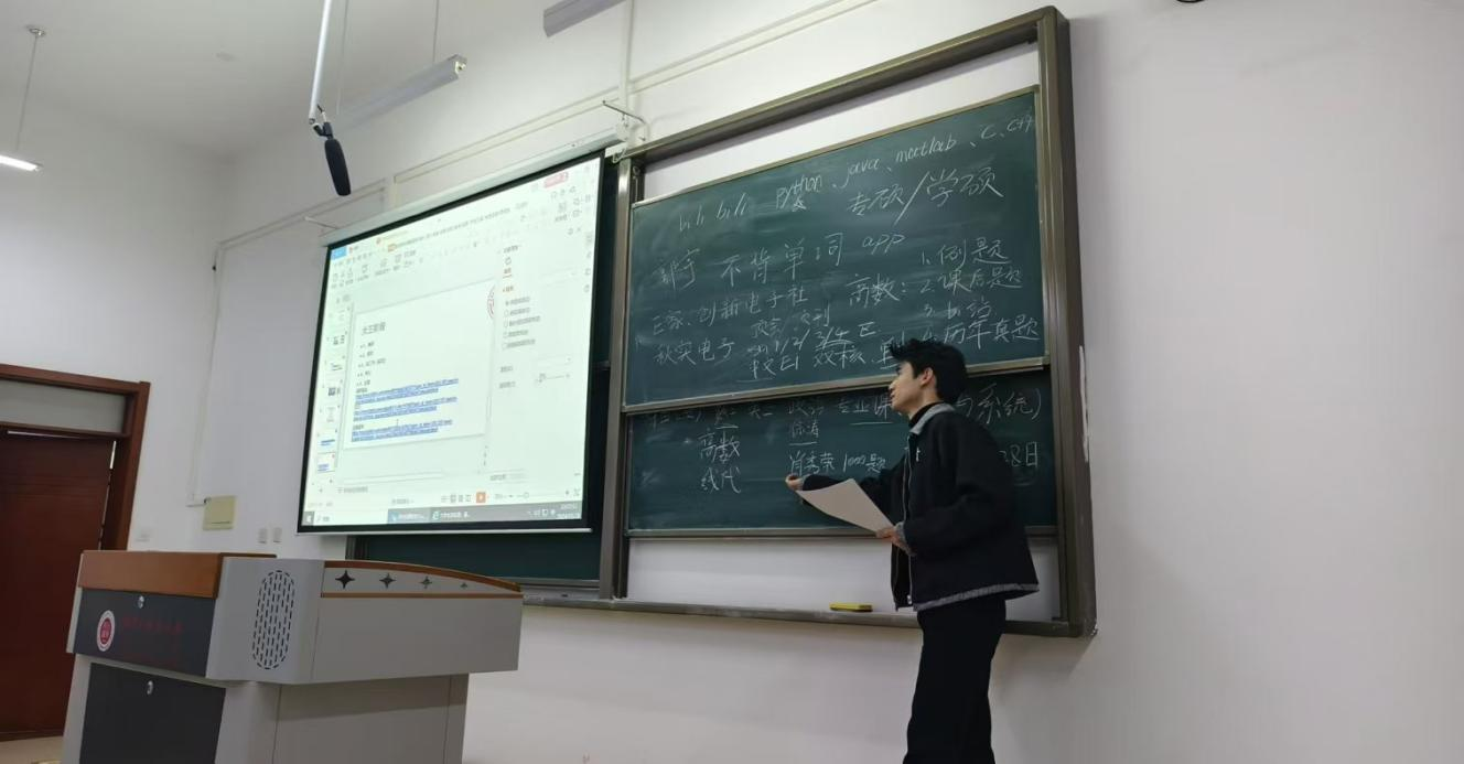 宣讲中,连祎来从大学生活、学习规划、参加社会实践、科技创新入门与参赛、学生工作、学生干部经验、考研最新政策解读、考研时间解析、考研专业/院校选择、复习备考规划等多个维度进行了详细讲解。他现场例举优秀学子现在发展例子与学生工作的优势。崔凡冰以“为什么要考研?”“考研需要具备哪些能力?”“考研能给我们带来什么?”等问题,与在场学生们进行互动问答。范英豪详细介绍了学硕与专硕的区别,他从生涯规划的角度出发,为不同专业的同学推荐了合适的职业类型,帮助同学们明确了考研目标及备考方法。周佳琪围绕考研的专业方向选择、目标院校筛选、复习计划制定等核心议题进行细致剖析。他们以自己的经验告知大家考研是一场持久战,需要同学们有着坚定的信念和合理的规划,提前准备科学规划。引导大家合理规划备考时间,提高学习效率,为自己的未来发展打下坚实的基础。