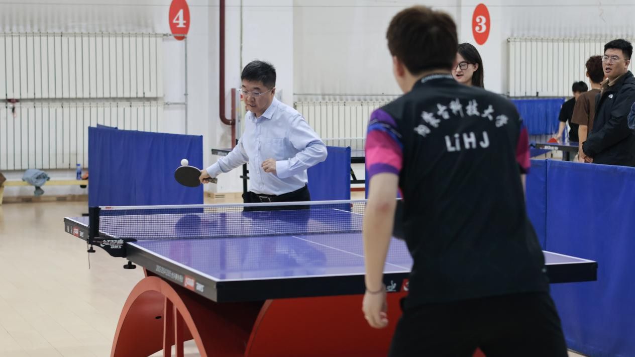 在开幕式上,学院党委书记王静宇强调:“体育是五育并举的重要环节,既强健体魄,更锤炼科研意志。”他指出,本次比赛旨在搭建“以赛促学、以赛促研”的学术交流平台。随后,王书记与研究生选手进行乒乓球切磋,通过“师生同台竞技”的方式,展现了体育精神与学术追求的有机融合,为跨学科交流创造了良好契机。