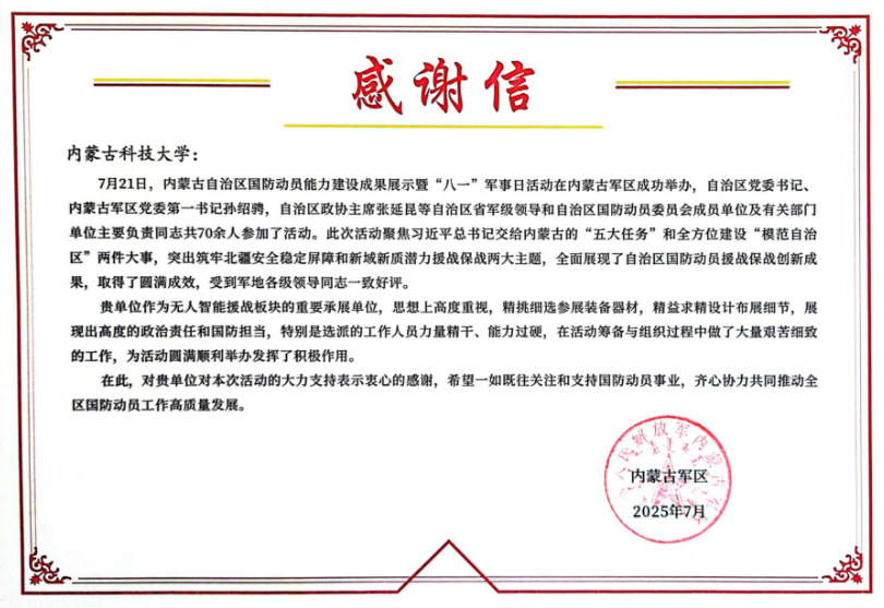 近日,我院学生科技作品参加国防动员能力建设成果展示活动暨“八一”军事日活动。自治区党委书记、内蒙古军区党委第一书记孙绍骋,自治区政协主席张延昆等自治区省军级领导同志集体参加了此项活动。